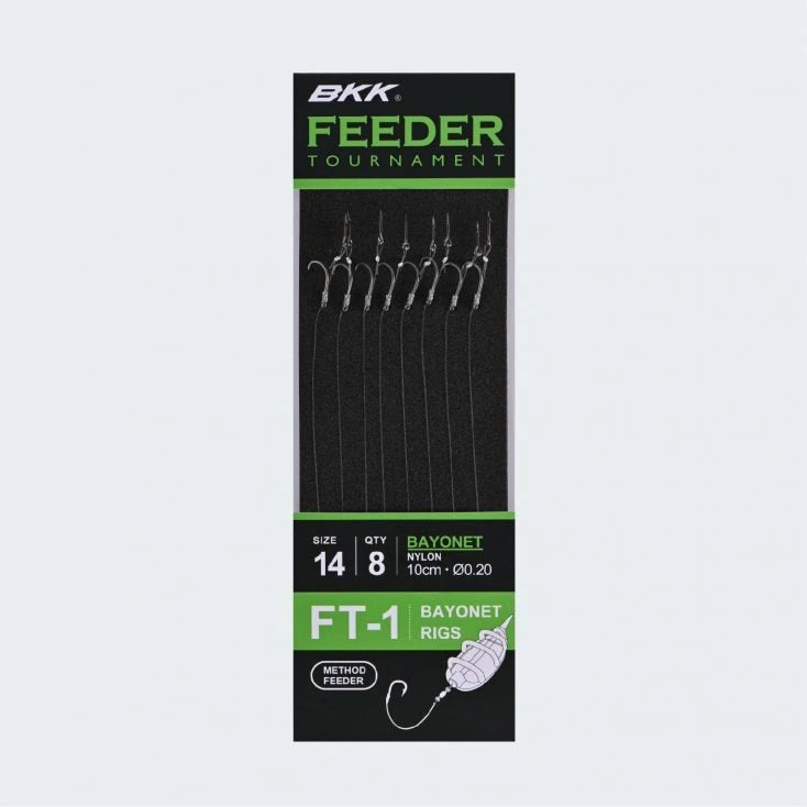 De BKK FT-1 Feeder Tournament Rigs zijn een serie haaklengtes die zijn ontwikkeld om onmiddellijke penetratie en maximale sterkte te bieden bij het vangen van grote vissen met de feeder. Deze weerhaakhaakjes zijn voorzien van de kenmerkende SS-afwerking van BKK, zijn nauwkeurig vooraf vastgemaakt aan hoogwaardige lijnen en beschikken over verschillende aashouders om allerlei soorten aas, zoals maïs, pellets, brood of vlees, te kunnen bevestigen.