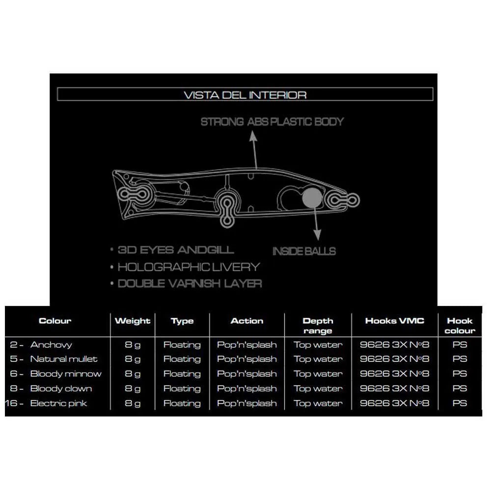 Deze agressieve kleine popper is net als zijn grote broer heel makkelijk te werpen en wordt ondanks zijn kleine formaat krachtig geworpen. Hij kan grote hoeveelheden water verplaatsen na zijn aanval. Hij kan schokkerig of over grotere afstanden bewegen, waardoor er door het sproeieffect en de daardoor veroorzaakte straal een zichtbaar kielwater in zijn kielwater ontstaat.