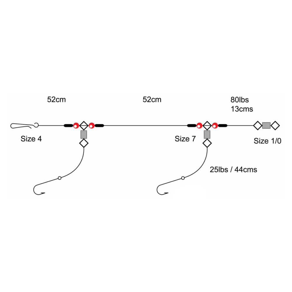 - Met twee haakriggen kan de visser op verschillende dieptes vissen, met één aas dicht bij de zeebodem en één hoger, of beide op de zeebodem wanneer er met een slappe lijn wordt gevist.